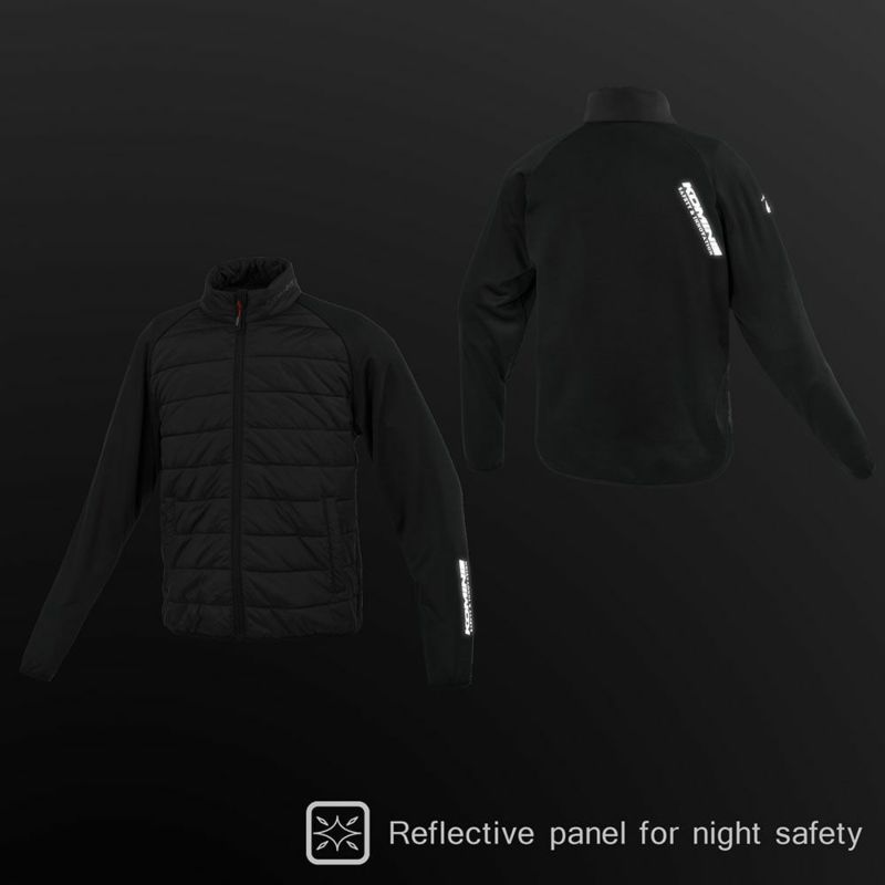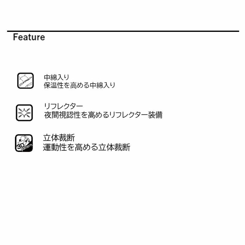 冷たい風を受け止める前面には保温性の高い中綿を使用し、袖や背面には動きの妨げにならない薄手で伸縮性の良いフリースを使用。