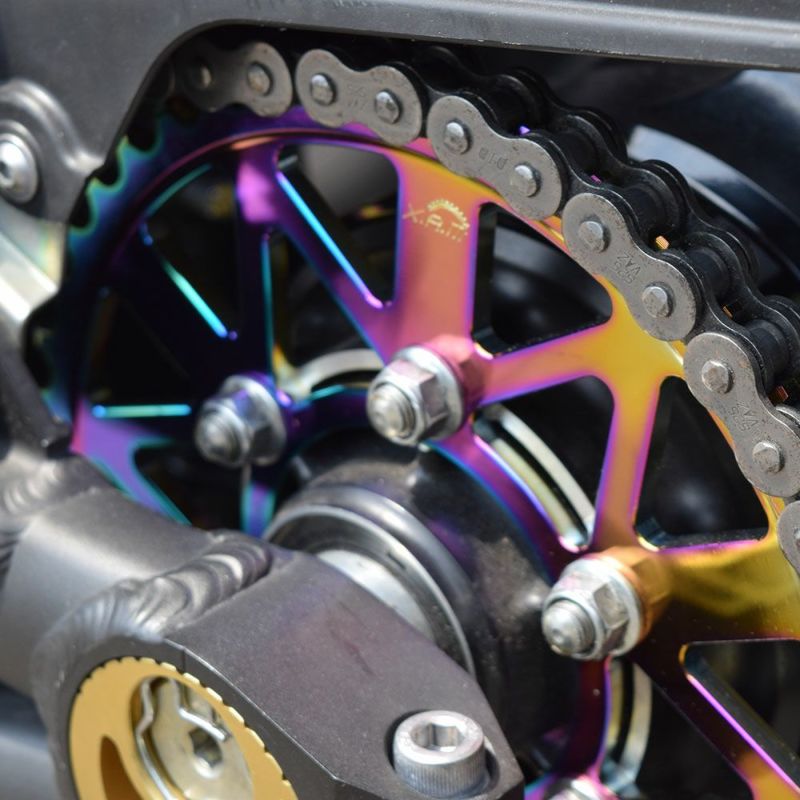 ミニバイク用タフライトスチールスプロケットは、強度に優れる鋼鉄材料に大胆な肉抜き加工を施し、色鮮やかな特殊メッキ加工で注目度抜群!