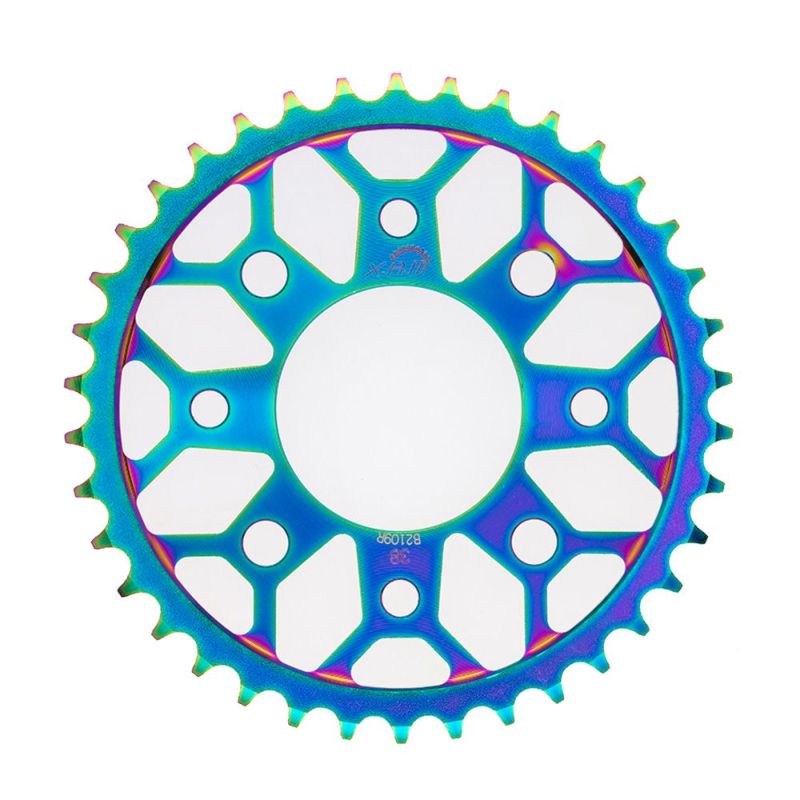 ミニバイク用タフライトスチールスプロケットは、強度に優れる鋼鉄材料に大胆な肉抜き加工を施し、色鮮やかな特殊メッキ加工で注目度抜群!