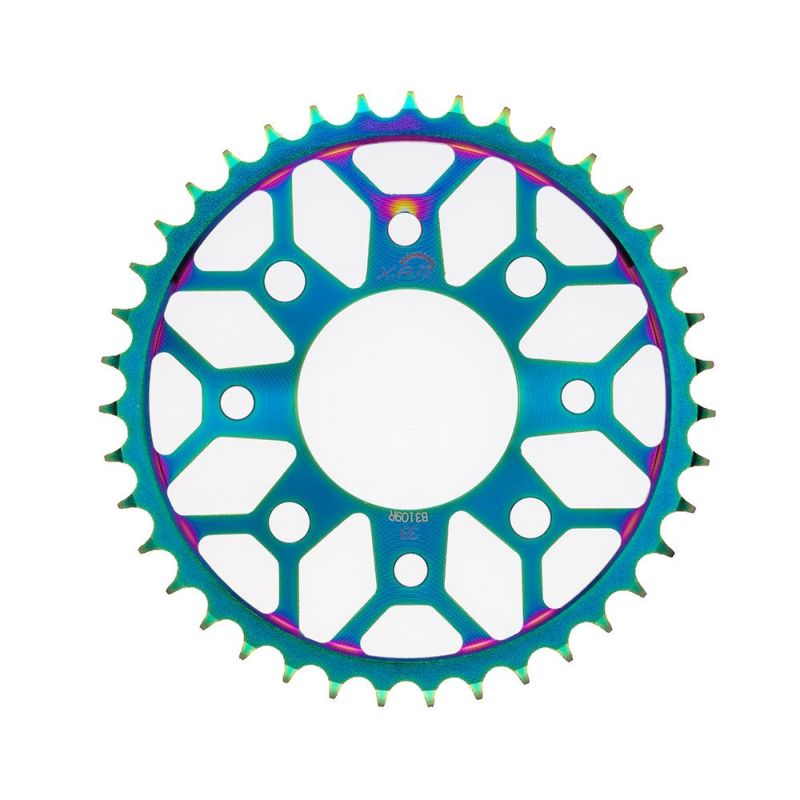 ミニバイク用タフライトスチールスプロケットは、強度に優れる鋼鉄材料に大胆な肉抜き加工を施し、色鮮やかな特殊メッキ加工で注目度抜群!