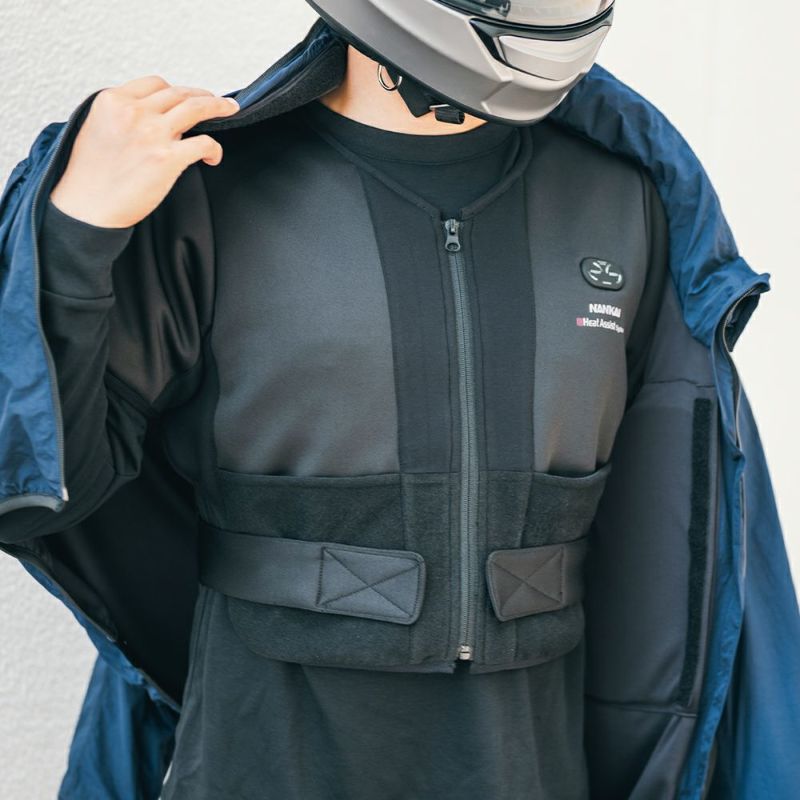 ・オートバイ用に合わせた、フロント2カ所、肩2カ所、背中の5つのヒーターを搭載。