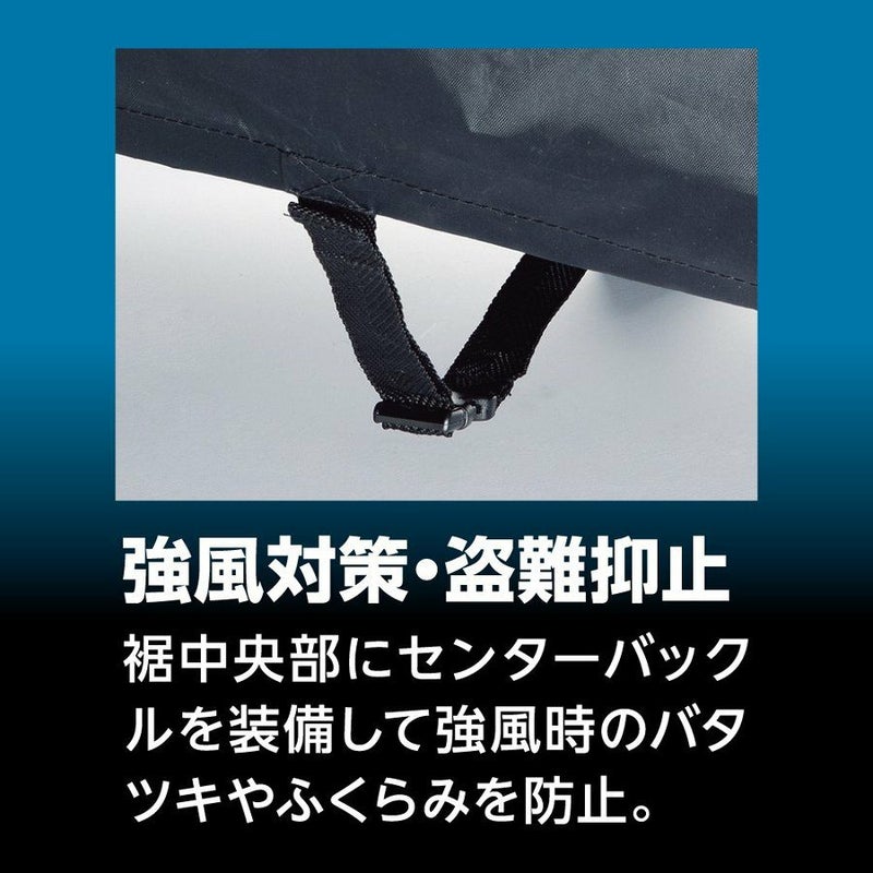 ●センターバックル:強風時のバタつきやめくれを防止・水ハネ対策にも有効