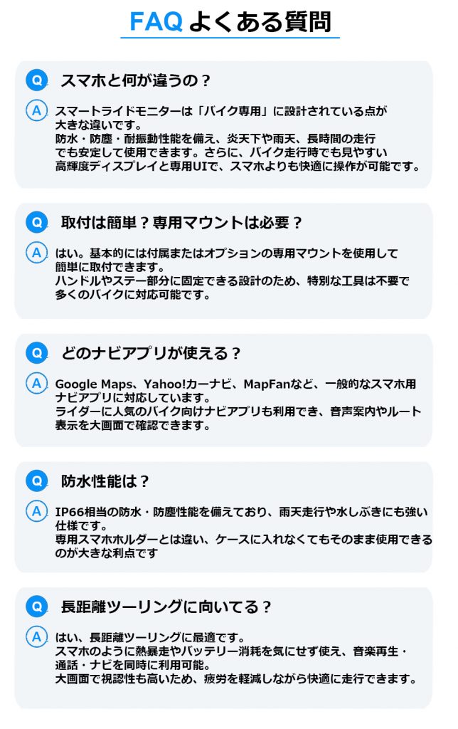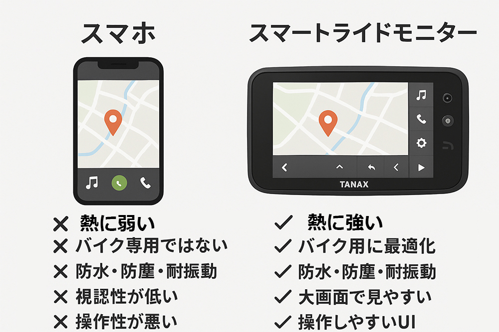 スマートライドモニターは、スマートフォンの便利な機能を「バイク専用」に最適化したディスプレイシステムです。