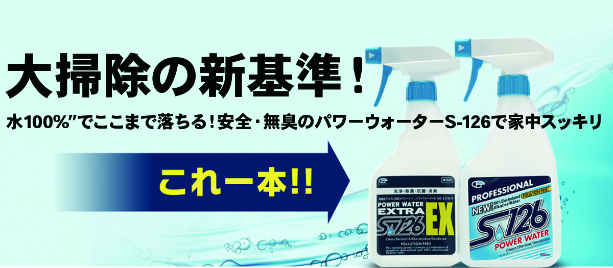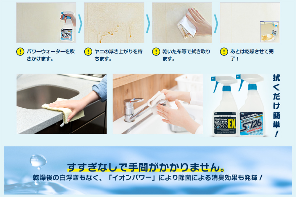 S-126 は、水100%なのに油汚れ・手アカ・ニオイまで強力に分解し、安心してどこにでも使える万能クリーナー。拭くだけでプロ並みに仕上がります。