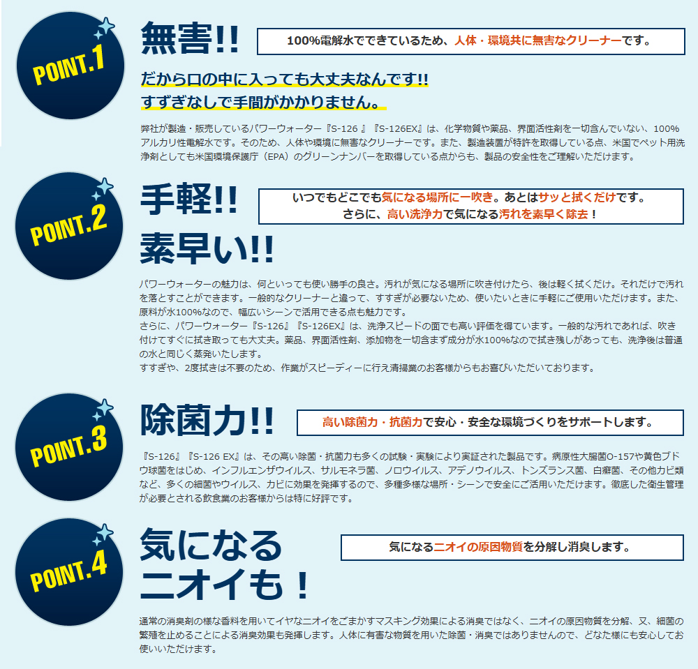 A. あります。電解水の働きで 洗浄・除菌・消臭・抗菌 を実現します。