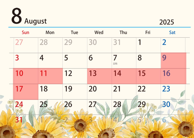大変勝手ながら当店のお盆休みにつきまして、下記の通りご案内申し上げます。